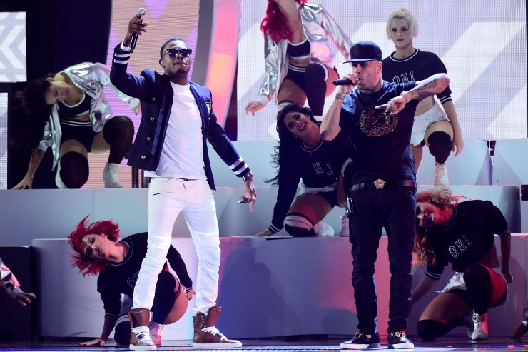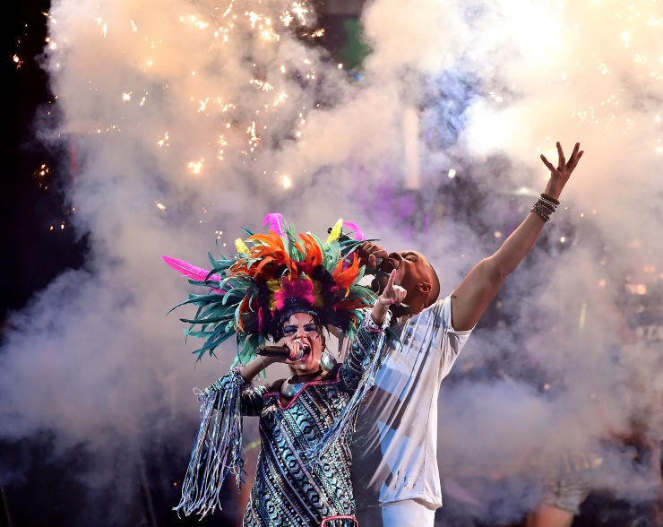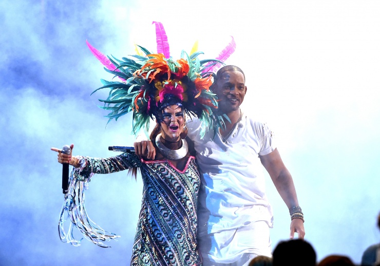 Will Smith subió al escenario vestido de blanco y rapeó en la versión remix de «Fiesta» con los colombianos de Bomba Estéreo, bañados por luces multicolor y rodeados por bailarines con poca ropa.