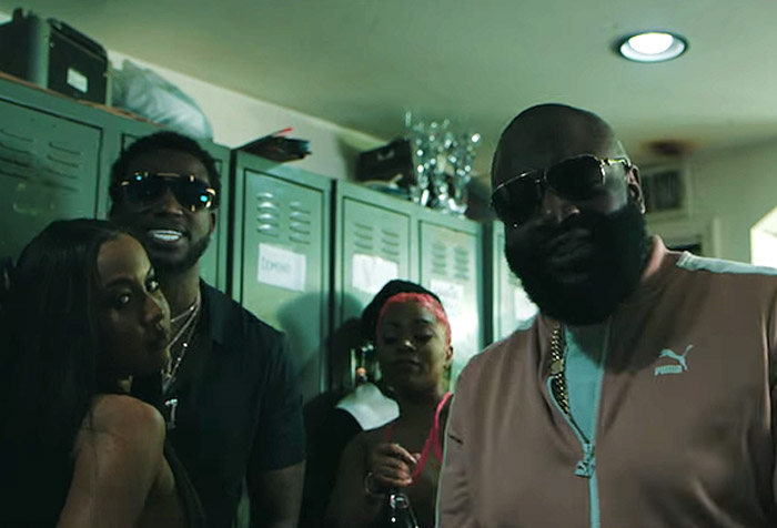 Antes de comenzar a trabajar en su próxima película indie, Rick Ross y Gucci Mane se dirigen al club de striptease en el video de «She On My Dick».